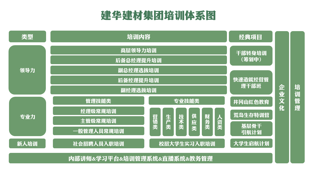 (3)干部培养包括基、中、高层管理的选拔与培养,直至高层管理人员领导力方面培训提升。