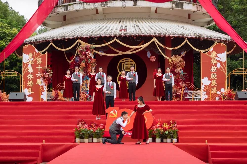 所有来宾挥舞国旗,齐声歌唱《没有共产党就没有新中国》,把现场的气氛推向高潮。伴着红心向党的告白,“百年初心,一‘榄’芳华”第十六届青年集体婚礼外场圆满礼成!