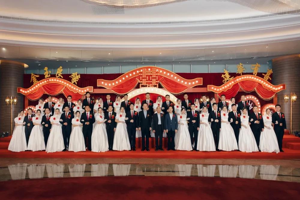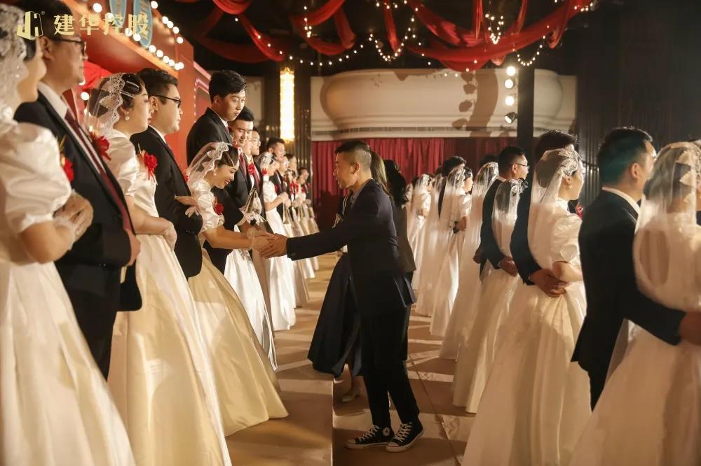 22对新人在鼓舞飞扬的开场舞中步入婚礼殿堂,幸福喜悦在每个人脸上洋溢。