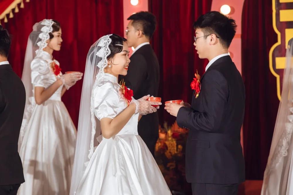 新人在领导嘉宾的见证下互送礼物,共同许下相伴终生的爱情誓言。